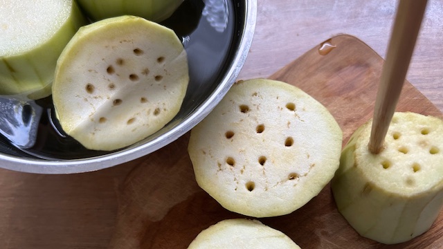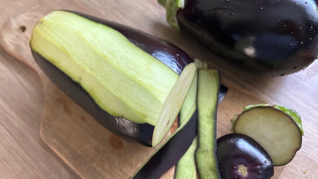 Auberginen waschen, Strunk entfernen und in 1 cm dicke Scheiben schneiden. Mit Essstäbchen mehrfach einstechen und 10 Minuten in Wasser legen. Abtropfen lassen.