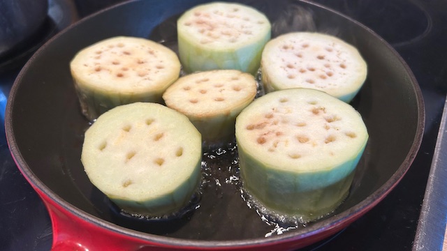 Öl in einer Pfanne erhitzen. Auberginenscheiben 5 Minuten anbraten, wenden und zugedeckt weitere 5 Minuten garen.