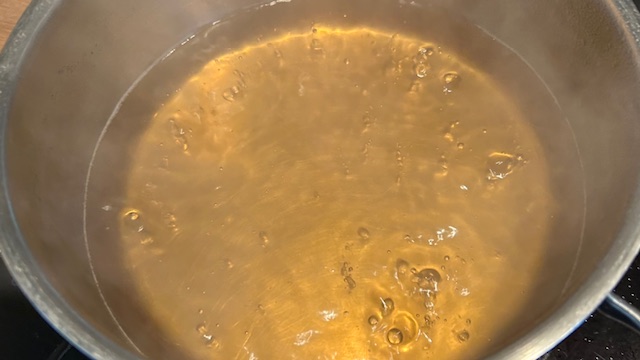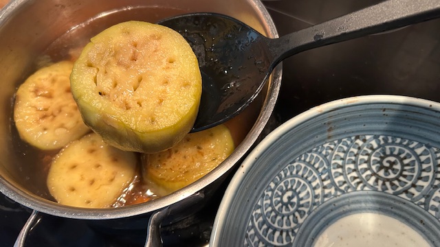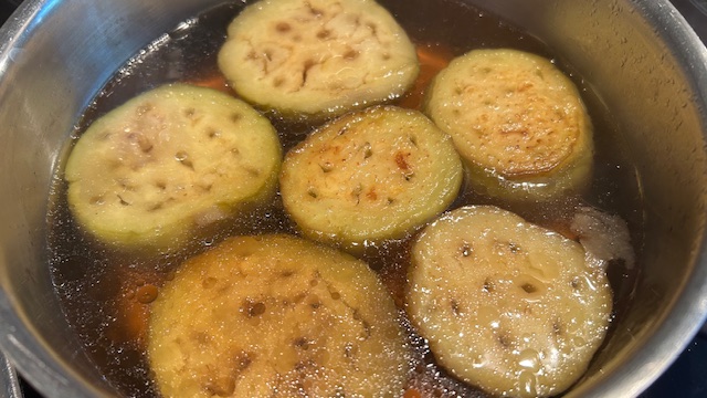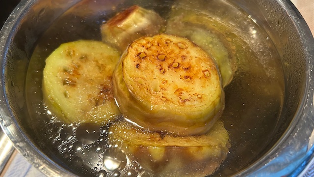 Dashi mit Zucker und Mirin in einen Topf geben, Auberginen hinzufügen und 10 Minuten köcheln lassen.