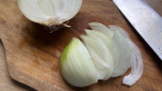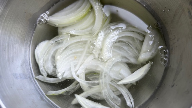 Zwiebel in feine Streifen schneiden. Auberginen mit der Dashi-Sauce in einem tiefen Teller anrichten und mit Zwiebel, Chilifäden und Katsuobushi bestreuen.