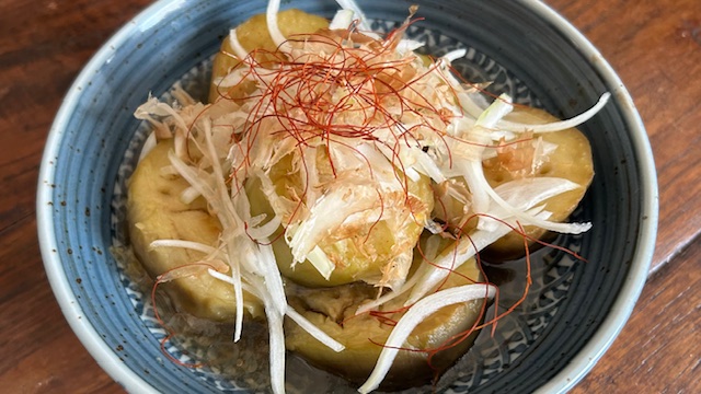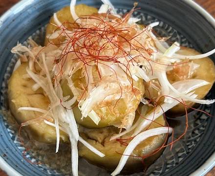 Sanft geschmorte Auberginen, die das Aroma einer leichten Dashi-Brühe aufnehmen, sind eine klassische Beilage in der japanischen Küche. Mit Zwiebeln, Chilifäden und Katsuobushi garniert, entsteht ein feines Gericht, das warm oder kalt serviert werden kann.
