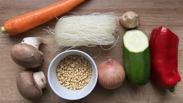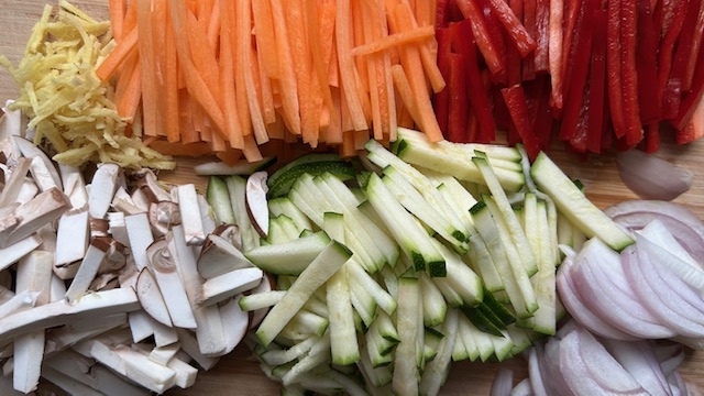 Champignons, Karotte, Zucchini und Paprika in feine Streifen schneiden. Ingwer und Zwiebel schälen und ebenfalls in feine Streifen schneiden.