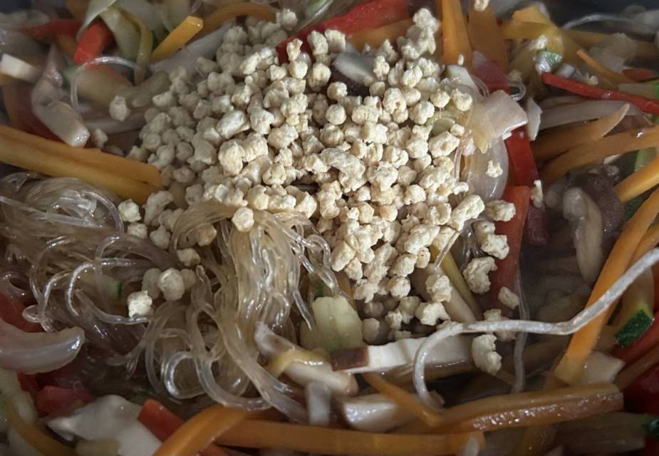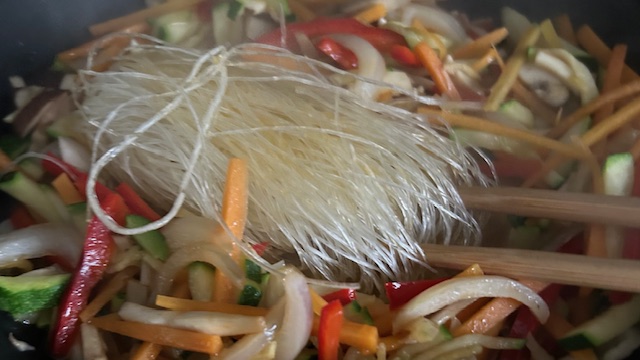 Öl in einer Pfanne erhitzen. Gemüse bei mittlerer bis starker Hitze etwa 3 Minuten anbraten. Glasnudeln hinzufügen und Wasser darüber gießen.