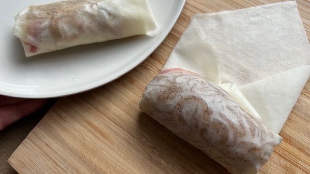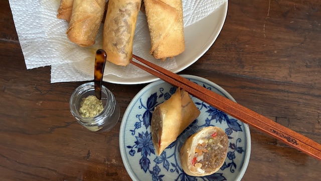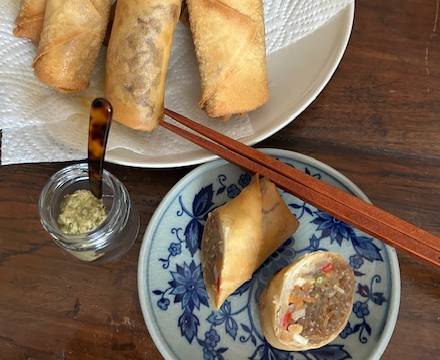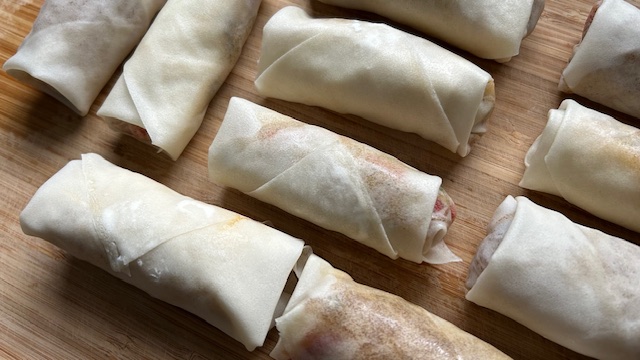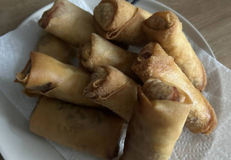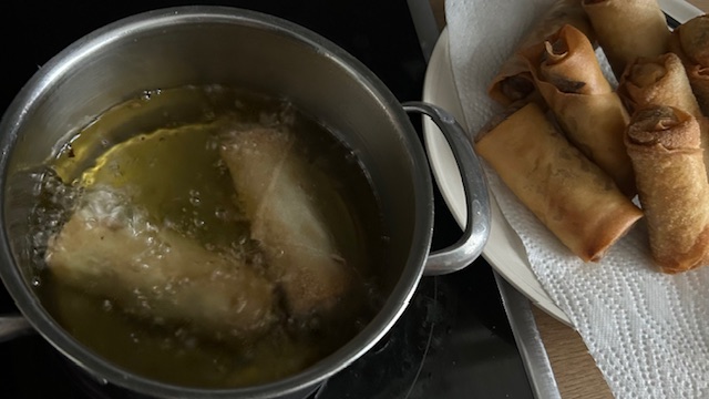 Pflanzenöl auf etwa 180 °C erhitzen. Frühlingsrollen ca. 4 Minuten goldbraun frittieren. Auf Küchenpapier abtropfen lassen.