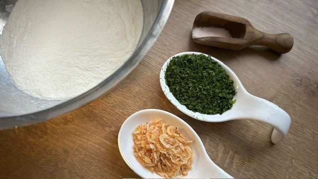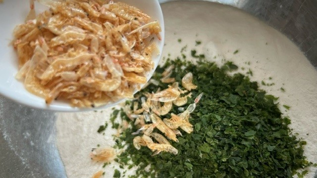 Mehl, Salz, Aonori und Sakura-Ebi mischen. Sonnenblumenöl dazugeben und mit den Fingern zügig mischen. Das Öl dabei gut verteilen. Wasser peu à peu dazugeben und alles zu einer Masse verkneten.