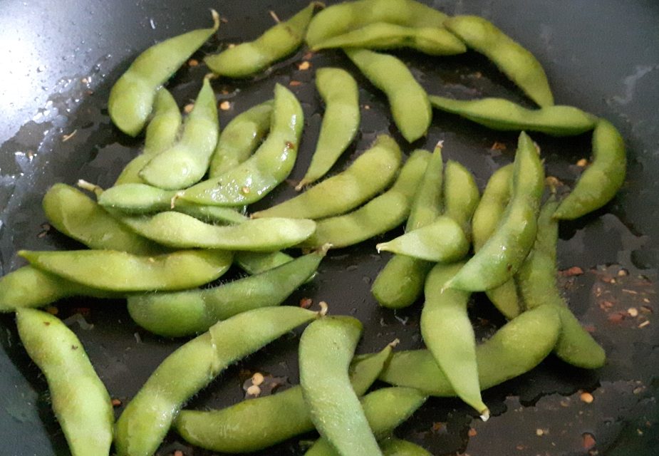 Zwischenzeitlich das Öl in einer Pfanne erhitzen und die Chiliflocken kurz darin braten. Jetzt die abgetropften Edamame mit in die Pfanne geben und braten – alles gut schwenken, sodass sich die Chiliflocken gleichmäßig verteilen.