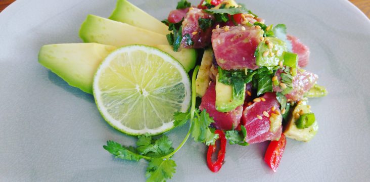 Eins meiner japanischen Lieblingsgerichte (besonders im Sommer) ist Thunfisch-Salat auf Reis. Es ist die japanische Variante des hawaiianischen Reisgerichtes Ahi Poke, zwar ohne Avocado und Ingwer, dafür mit zarten rohen Thunfisch-Scheiben und mit einer klassisch japanischen Würzsauce. Gurke und Wakame-Algen sorgen für eine erfrischende Leichtigkeit. Für Liebhaber scharfer Speisen ist es mit japanischem Wasabi gewürzt, das regt die Verdauung an und ist trotz der heißen Sommertage angenehm schweißtreibend.