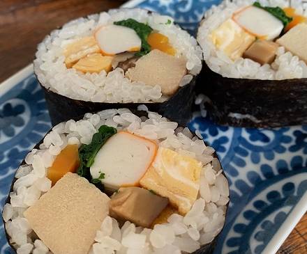 Diese dicken Sushi-Rollen werden sowohl beim Setsubun (dem japanischen Fest zum Winterende) als auch zwischendurch gern gegessen. Wenn man sie wie hier in Scheiben schneidet, lassen sie sich problemlos verzehren und sehen dazu noch sehr dekorativ aus!
