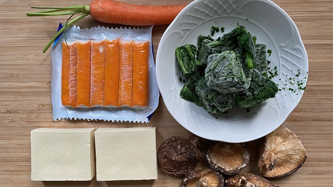 Spinat auftauen. Karotte schälen und in 8 dünne Streifen schneiden. Shiitake-Pilze für 30 Minuten in lauwarmem Wasser einweichen und den Strunk abschneiden.