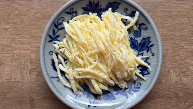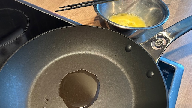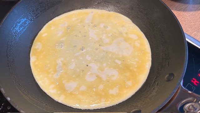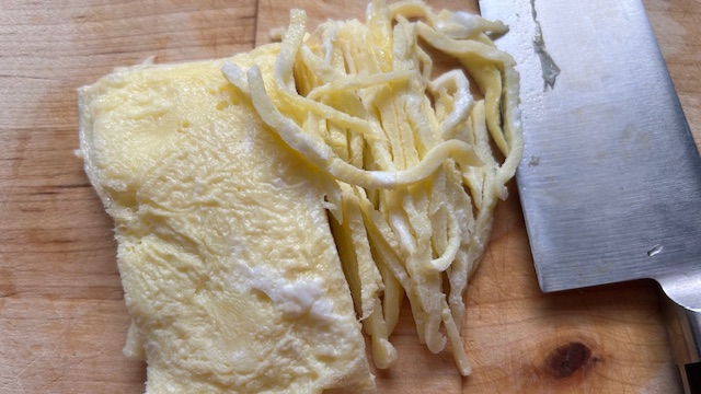 Ei mit Salz verquirlen. Öl in einer beschichteten Pfanne erhitzen und bei mittlerer Hitze ein dünnes Eier-Crêpe ca. 1 Minute backen. Hitze ausschalten, Crêpe wenden und nach 30 Sekunden aus der Pfanne nehmen. In sehr feine Streifen schneiden.