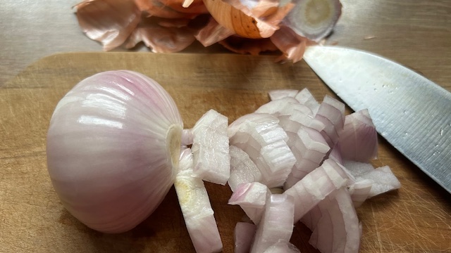 Zwiebel fein hacken. Butter in einer Pfanne erhitzen und die Zwiebel bei mittlerer Hitze langsam glasig anbraten.