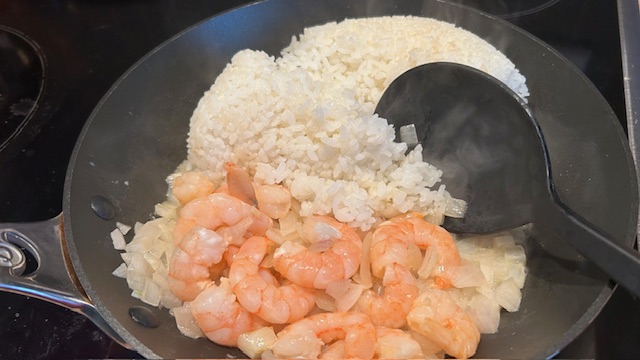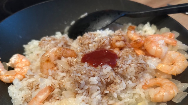 Garnelen hinzufügen und 1 Minute mitbraten. Reis, Ketchup, Worcestersauce, Sojasauce und Currypulver zugeben und alles gründlich vermengen.