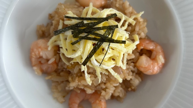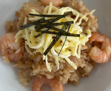 Garnelen-Reis auf Tellern anrichten, mit Ei- und Nori-Streifen garnieren und warm servieren.