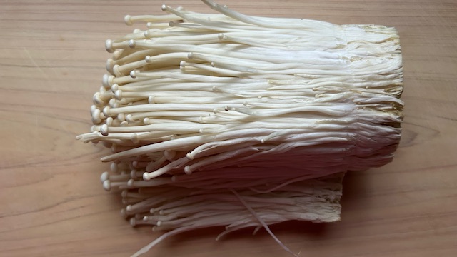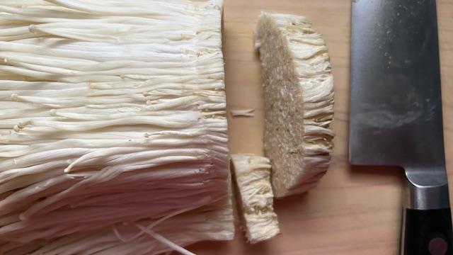 Den unteren, festen Teil der Enoki-Pilze (ca. 1 cm) entfernen.