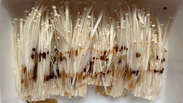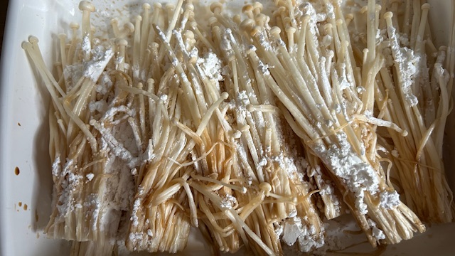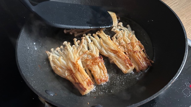 Öl in einer beschichteten Pfanne erhitzen. Enoki-Portionen bei mittlerer Hitze ca. 1 Minute knusprig anbraten, wenden und weitere 1 Minute braten.