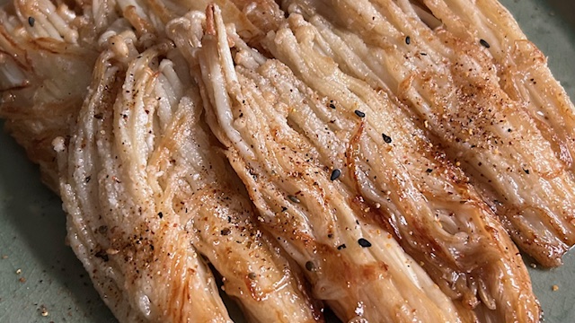 Außen knusprig, innen zart: Enoki-Pilze lassen sich mit wenigen Zutaten in eine aromatische Beilage verwandeln. Sojasauce sorgt für Würze, Shichimi-Tōgarashi für eine feine Schärfe. Ideal als Snack oder Topping.