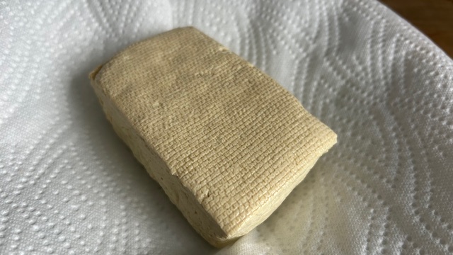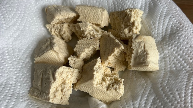Tofu in grobe Stücke teilen und auf Küchenpapier legen. Mit weiterem Küchenpapier vorsichtig trocken tupfen.