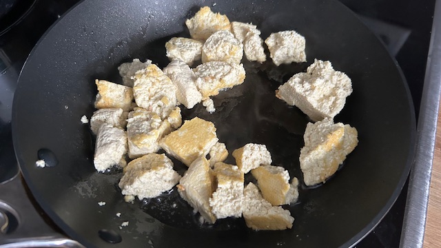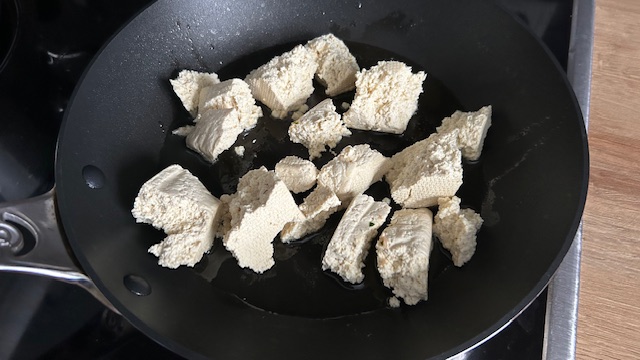 Sesamöl in einer Pfanne erhitzen. Tofu bei hoher Hitze ca. 1 Minute anbraten.