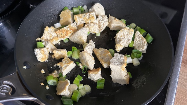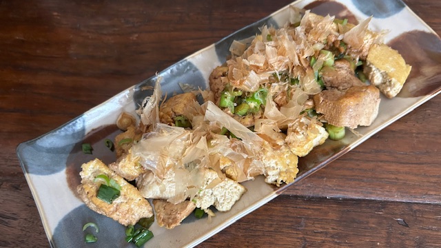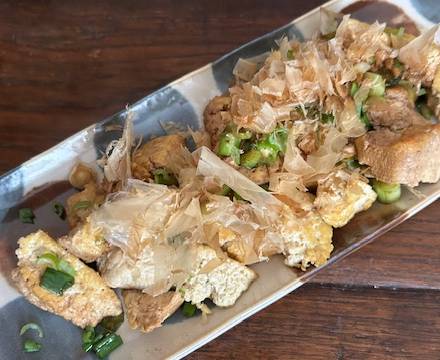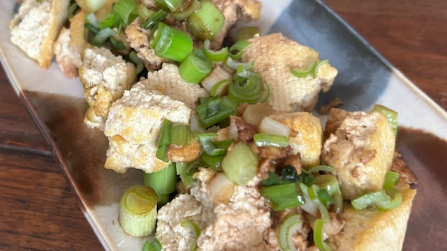 Außen leicht knusprig, innen weich: Kaminari-Dōfu („Donner-Tofu“) ist ein einfaches japanisches Gericht, bei dem Tofu kurz scharf angebraten und mit Sojasauce, Frühlingszwiebeln und Katsuobushi verfeinert wird.