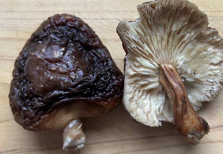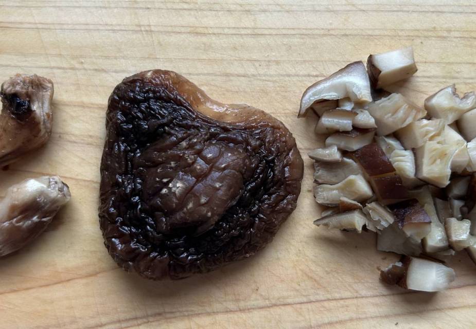 Shiitake-Pilze 30 Minuten in Wasser einweichen. Stiele entfernen und die Pilze fein würfeln.