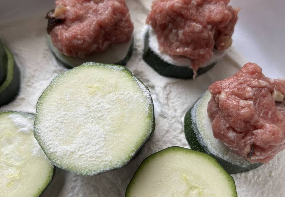 Hackfleisch in 10 Portionen teilen und jeweils auf eine Zucchinischeibe legen. Mit einer zweiten Scheibe bedecken und leicht zusammendrücken.