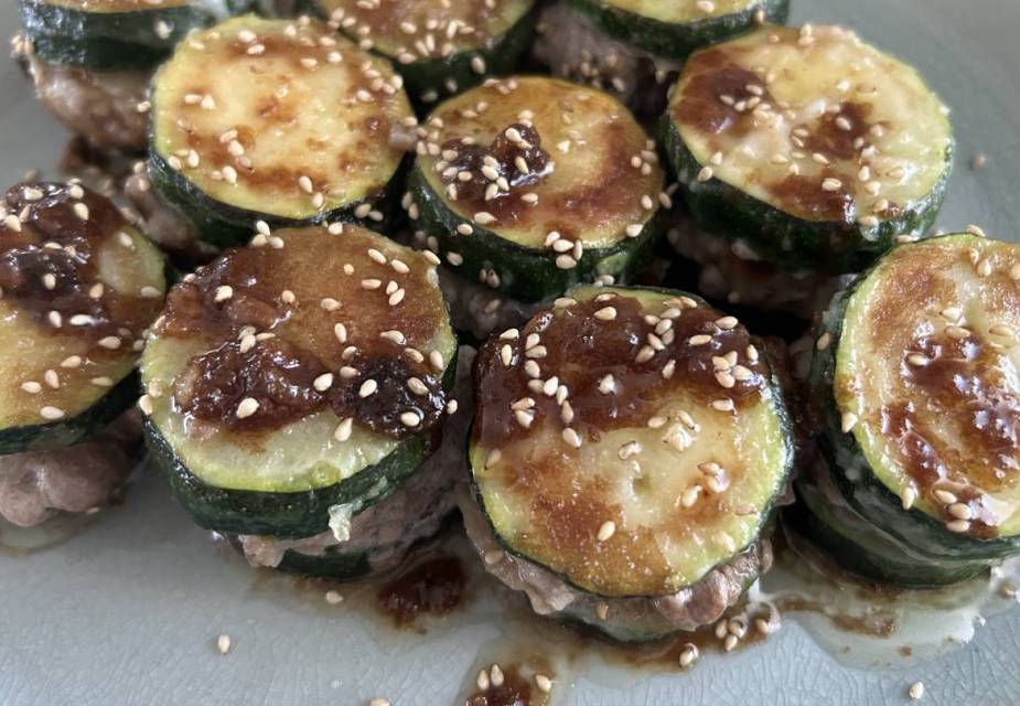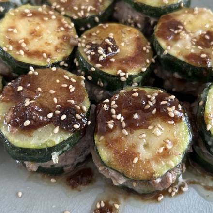 Saftiges Hackfleisch, aromatischer Ingwer und Zucchini bilden zusammen kleine gefüllte Türmchen mit würziger Sauce. Dieses japanisch inspirierte Rezept verbindet einfache Zutaten zu einem herzhaften Gericht.