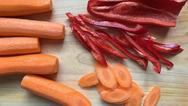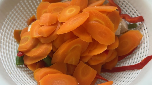Karotten schälen und in dünne, schräge Scheiben schneiden. Bohnen putzen und in Salzwasser 8 Minuten kochen. Paprika entkernen und in Stücke schneiden. Tofu in kleine Würfel schneiden.