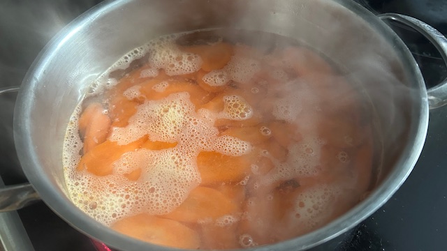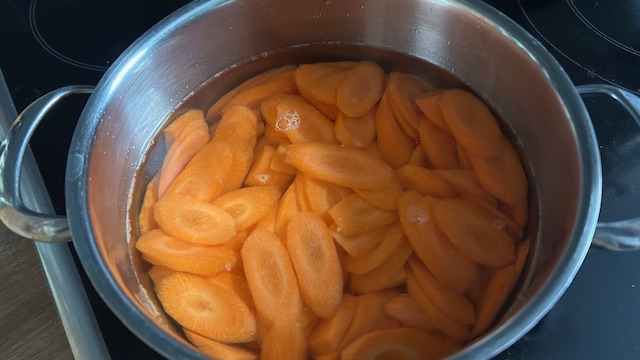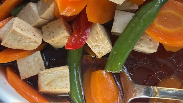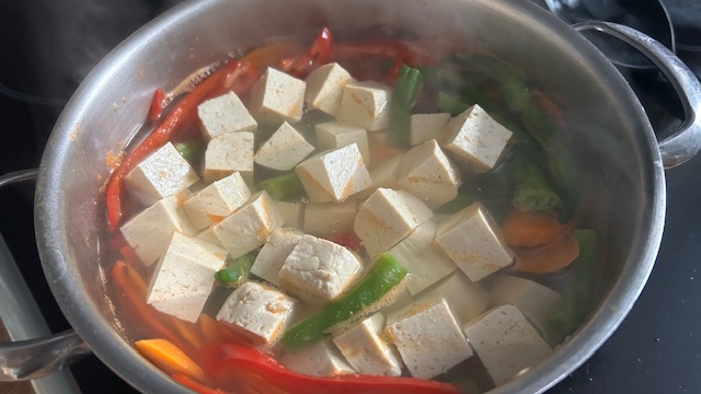 Karotten in einem Topf mit Wasser aufkochen, Hitze reduzieren und 5 Minuten garen. Tofu, Bohnen und Paprika hinzufügen und weitere 3 Minuten kochen.