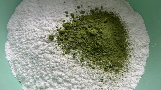 Mochi: Klebreismehl, Zucker und Matcha-Pulver mischen. Nach und nach kochendes Wasser zugeben und gut verrühren, bis eine gleichmäßige Masse entsteht.