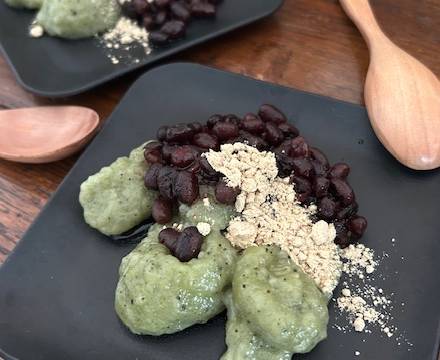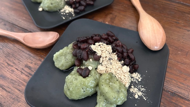 Matcha-Mochi mit den Azuki-Bohnen anrichten und mit geröstetem Sojabohnenmehl bestreuen.