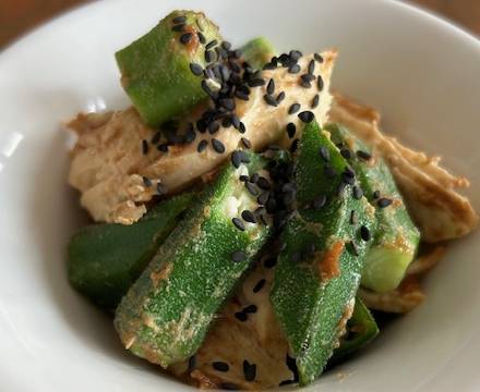 Zarte Okraschoten treffen auf saftiges Hähnchenfleisch und eine cremige Sesamsauce: Dieses japanische Rezept kombiniert frische Texturen mit nussiger Tiefe und eignet sich sowohl als Beilage als auch als leichtes Hauptgericht.