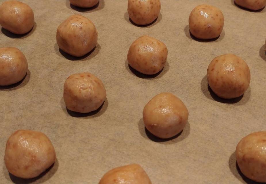 Kleine Bällchen formen. Im Ofen ca. 15 Minuten backen. In Puderzucker wälzen.