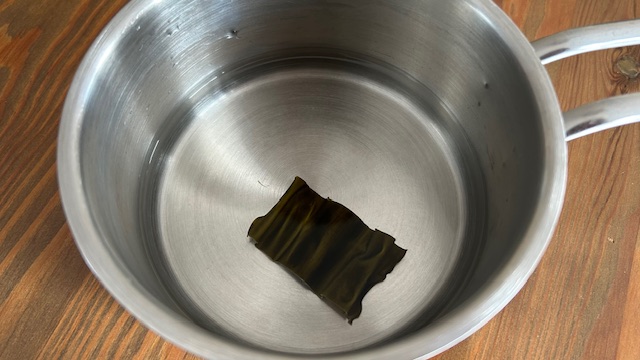 Kombu mit dem Wasser in einem Topf 15 Minuten ziehen lassen, dann einmal aufkochen und vom Herd nehmen. Kombu entfernen und die Brühe abkühlen lassen.
