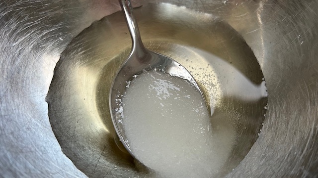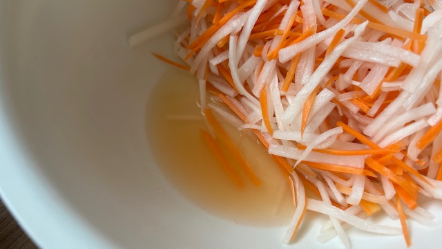 Kombu-Brühe mit Reisessig, Zucker und Salz verrühren. Karotte und Rettich untermischen.