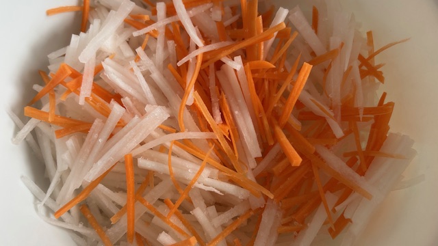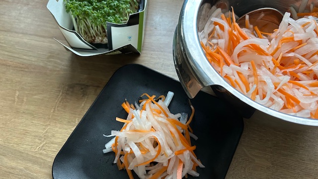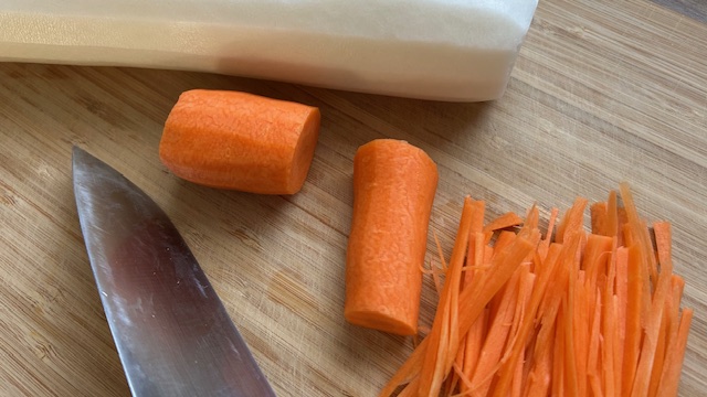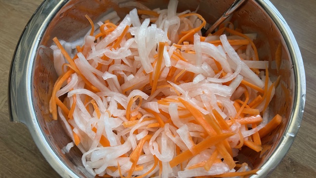 Karotte und Rettich in ca. 4 cm lange, feine Julienne schneiden. Mit ½ TL Salz vermengen und 10 Minuten ziehen lassen, anschließend die entstandene Flüssigkeit ausdrücken.