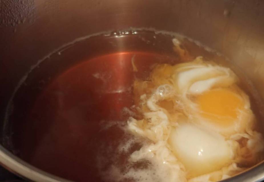 Das Dashi aufkochen und darin 2 Eier pochieren. In einem anderen Kochtopf reichlich Wasser aufkochen und die Udon-Nudeln gar kochen. Abtropfen und die Nudeln mit kaltem Wasser waschen.