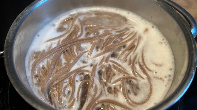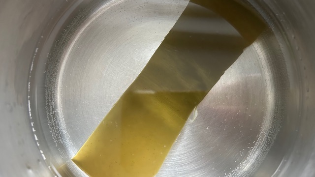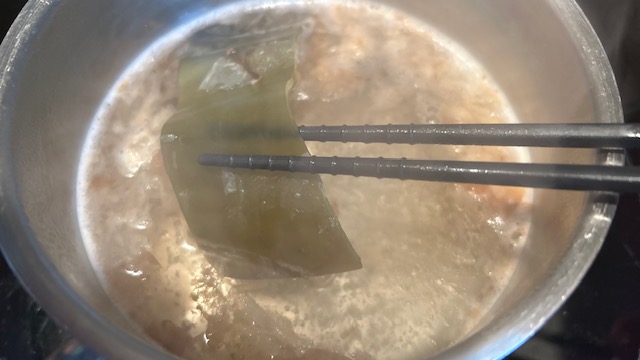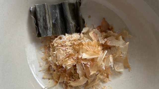 Kombu und Katsuobushi mit 500 ml Wasser 1 Stunde ziehen lassen, dann kurz aufkochen. Durch ein Sieb gießen, um Kombu und Katsuobushi zu entfernen. Brühe mit Sojasauce und Mirin 1 Minute aufkochen.