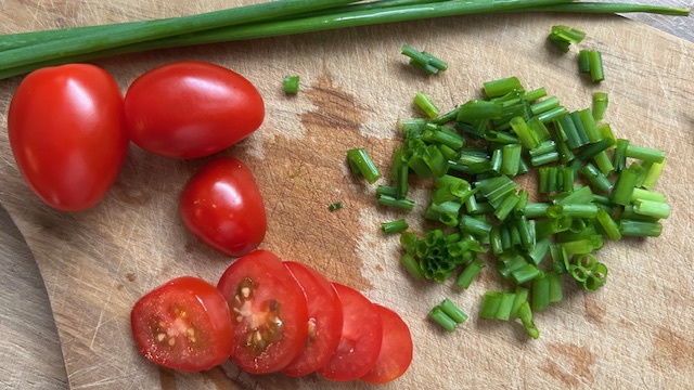 Rettich fein reiben. Schnittlauch in Röllchen, Nori in Streifen, Tomaten in Scheiben schneiden.
