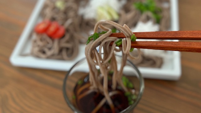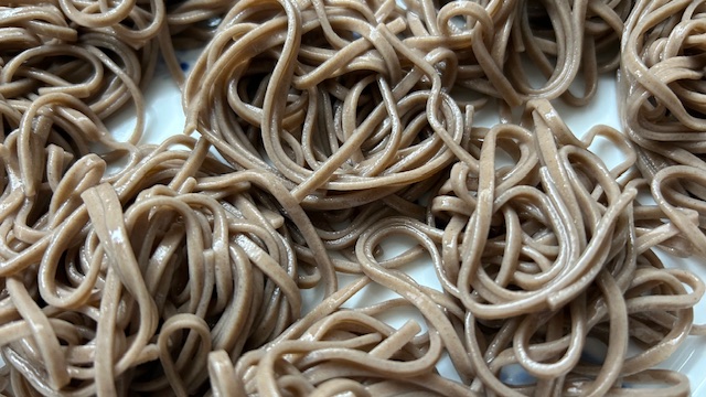 Soba nach Packungsanleitung kochen, abgießen und in kaltem Wasser gründlich waschen. Wasser wechseln und erneut spülen, bis die Nudeln gut abgekühlt sind. Abtropfen lassen und in mundgerechten Portionen auf Tellern anrichten.