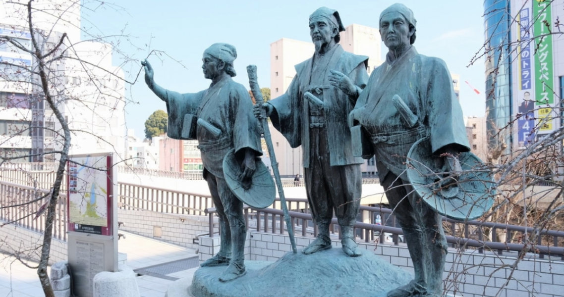 Gleich rechts vom Ausgang des JR-Bahnhofs Mito steht die Statue (oben) des Mannes, der dank einer langjährigen Serie des Senders TBS wohl der berühmteste Bewohner der Provinz ist: Mito Kōmon. Seine Figur wird flankiert von zwei treuen Dienern namens Suke und Kaku (links bzw. rechts). Kōmon war der literarische Name von Tokugawa Mitsukuni (1628–1701), einem Enkel des Dynastiegründers Tokugawa Ieyasu. Er wurde nur wenige Gehminuten vom Bahnhof Mito entfernt geboren, wo eine Tafel vor einem ihm geweihten Shintō-Schrein seine Geburtsstätte markiert. Um 1690 zog sich Mitsukuni aus dem öffentlichen Leben zurück und verbrachte die letzten zehn Jahre seines Lebens in einer Einsiedelei, wo er am Dainippon-shi, einer monumentalen Geschichte Japans, arbeitete. Das Werk wurde erst rund 250 Jahre später, im Jahr 1906, offiziell veröffentlicht.